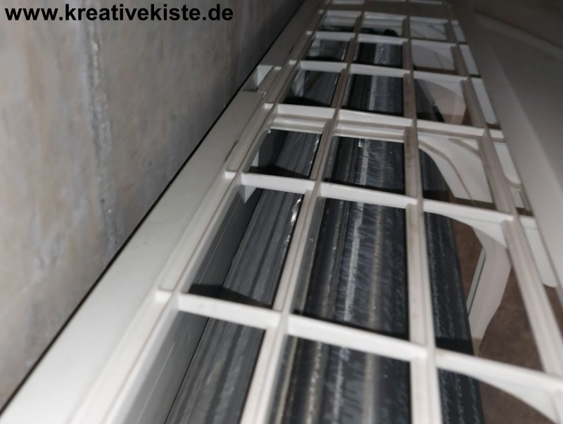 - Den Wärmetauscher mit einem nicht aggressiven Reinigungsmittel einsprühen. ⚠️ Der Wärmetauscher ist V-Förmig achte darauf dass der Wärmetauscher auch hinten eingesprüht wird.