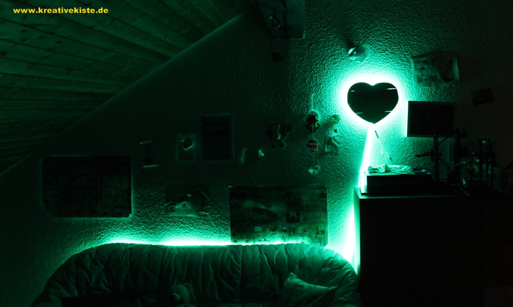 Durch die RGB Funktion lassen sich wirklich schöne Farben mischen. Und das Licht verteilt sich so schön an der Tapete dass das Herz richtig zu leuchten scheint. Da Paletten Bretter nie ganz gerade sind, scheint etwas Licht durch die Ritzen.